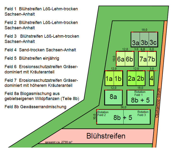 - Ansaat: 09.10.2017 mit 100% gebietseigenen Wildpflanzen; 46 Arten davon 41 Kräuter und 5 Gräser; Ansaatstärke 25 kg/ha
