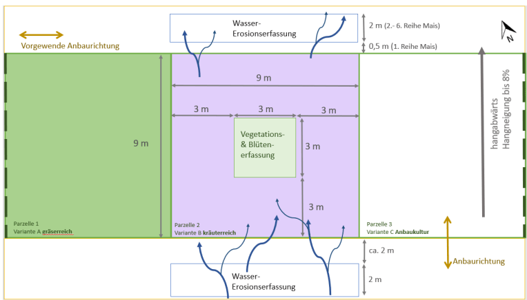 - 3 Varianten (2 Wildpflanzenmischungen & Ackerkultur), 4 Wiederholungen