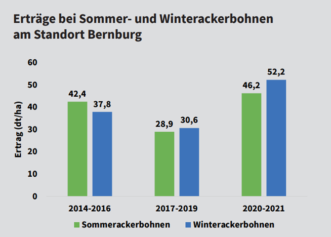 Die Ausweitung der Anbauflächen scheitert bisher an nicht ausreichenden und schwankenden Erträgen sowie am geringen Preisniveau. Mit der Klimaerwärmung entstehen Chancen für den Anbau von Winterackerbohnen. Diese können die vorhandene Winterfeuchtigkeit besser nutzen. Außerdem ist der Boden im Winter mit Pflanzen bedeckt und gegen Erosion geschützt.