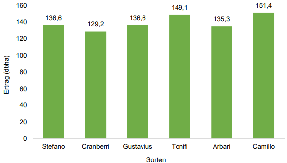 | Das Ertragsniveau war nach den vergangenen Magerjahren im Jahr 2021 ausgezeichnet. Die angebauten 6 Sorten brachten einen Durchschnittsertrag von 139,7 dt/ha. Dies war der bisher höchste Ertrag bei Körnermais im Artenvergleich. Auch der Ertrag der Sorte Camillo mit 151,4 dt/ha stellt einen neuen Rekord für den schon über 20 Jahre laufenden Artenvergleich dar. | |||