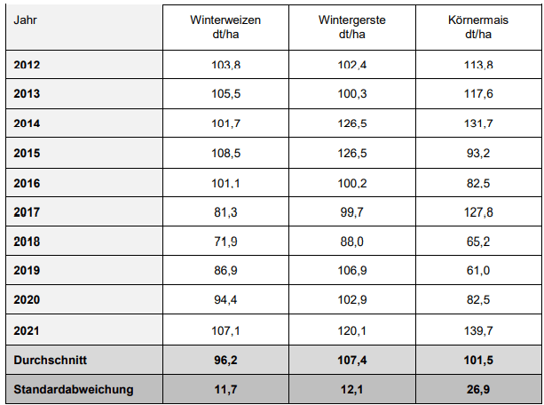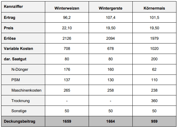 | Als Preise wurden die regionalen Preise zur Erntezeit angesetzt. Regionale Preise aus dem Frühjahr 2021 liegen auch der Berechnung der Kosten für Düngemittel und Pflanzenschutzmittel zugrunde. 13 Ökonomisch fällt der Körnermais gegenüber dem Winterweizen und der Wintergerste ab. Der Grund liegt in den hohen Trocknungskosten. Nur in dem Rekordjahr 2021 würde der Körnermais den Winterweizen und die Wintergerste im Deckungsbeitrag übertreffen. | |
