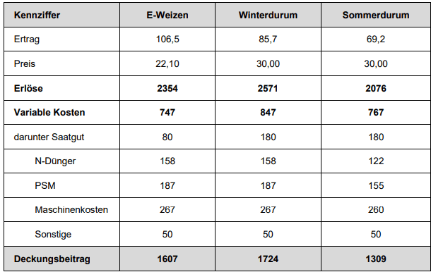 | Mit den Versuchsergebnissen die Deckungsbeiträge für E-Weizen, Winterdurum und Sommerdurum berechnet. Hinsichtlich der Mittelkosten wurden regionale Preise eingesetzt. Als Maschinenkosten wurden für die N-Düngung 6,50 Euro/ha und für den Pflanzenschutz 9,50 Euro/ha angesetzt. Alle weiteren variablen Kosten wurden aus Richtwerten übernommen. Für die Berechnung der Erlöse wurden die zum Zeitpunkt der Ernte geltenden Preise des örtlichen Getreidehändlers in Höhe von 22,10 Euro/dt für E-Weizen und 30,00 Euro/dt beim Durum angesetzt. Die Ergebnisse zeigen, dass sowohl beim Winterdurum wie auch beim Sommerdurum ein sehr gutes ökonomisches Ergebnis erreicht werden kann und diese Kulturen durchaus Fruchtfolgen bereichern können. |