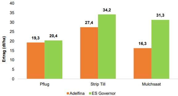 | Der Versuch lässt sich schlecht werten. Der Feldaufgang war sehr schlecht. Dies betraf die Anzahl der Pflanzen, wie auch die Verteilung auf der Fläche. Die Folge davon war eine erhebliche Verunkrautung bis zu Ernteerschwernissen. Hinzu kommt, dass die Sorte „Adelfina“ völlig versagt hat und keine belastbare Wertung erlaubt. Vom Trend her hat die Variante Strip Till beim Ertrag am besten abgeschnitten. | |||