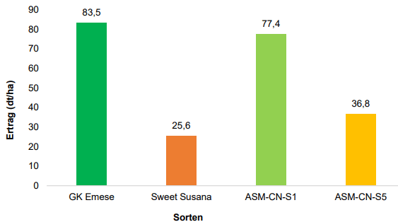 | Im Versuch geht es vor allem darum Stämme des Züchters im Vergleich zu zugelassenen Sorten zu testen. Auf Grund des kühlen Frühjahrs waren die Feldaufgänge bei allen Sorten schlecht. Der Stamm ASM-GK-5 entpuppte sich als Variante für eine Silierung und zeigte ein enormes vegetatives Wachstum. Bei einem Trockenmassegehalt von 28 % wurden Anfang Oktober 1460,8 dt/ha Originalsubstanz geerntet. Die Sorte Sweet Susana und der Stamm ASM-CN-S5 wurden nicht reif. Da für den November Regenperioden angekündigt waren, wurden sie am 28.10.2021 mitgeerntet. An den Erträgen wird deutlich, dass damit enorme Ausdruschverluste verbunden waren. | |||