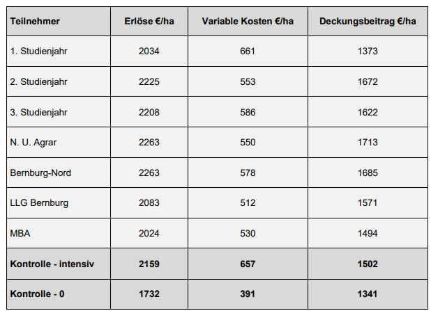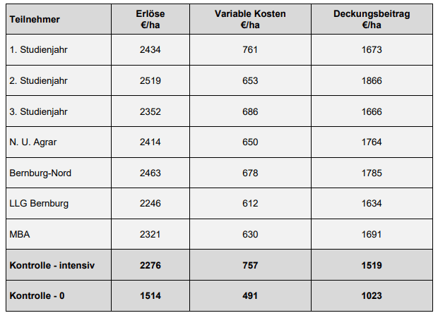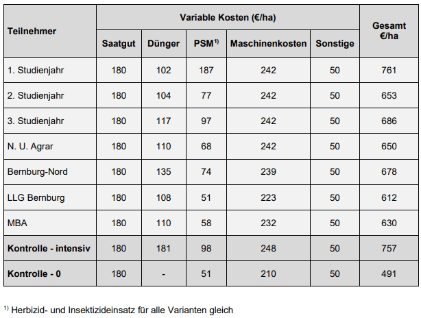 | Hinsichtlich der Mittelkosten wurden regionale Preise eingesetzt. Als Maschinenkosten wurden für die N-Düngung 6,50 €/ha und für den Pflanzenschutz 9,50 €/ha angesetzt. Alle weiteren variablen Kosten wurden wie in den Vorjahren einheitlich für alle Teilnehmer aus Richtwerten übernommen. | |