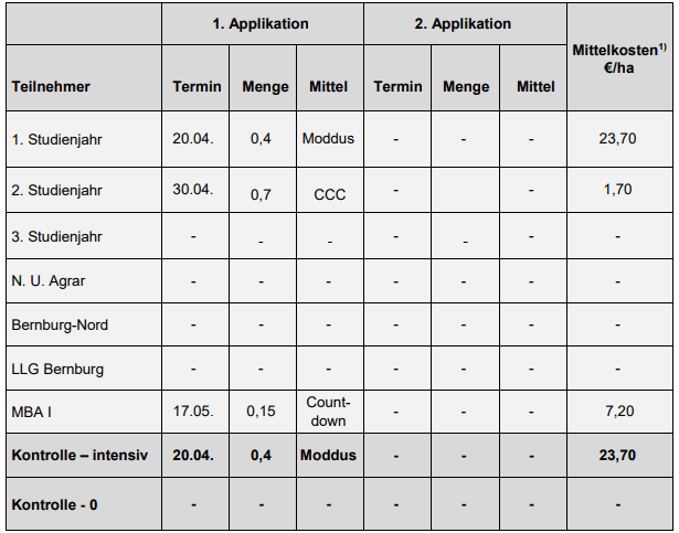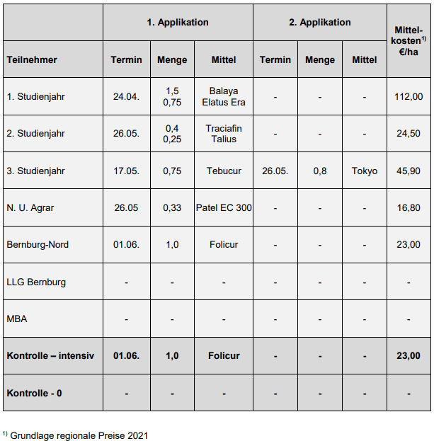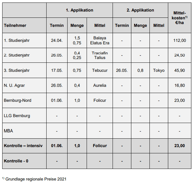 | Hinsichtlich des Einsatzes von Fungiziden gab es bei den Teilnehmern deutliche Unterschiede. Insgesamt war der Krankheitsdruck sehr gering. Zwei Teilnehmer verzichteten generell auf Fungizidbehandlungen. Nur ein Teilnehmer führte zwei Applikationen durch. | |||