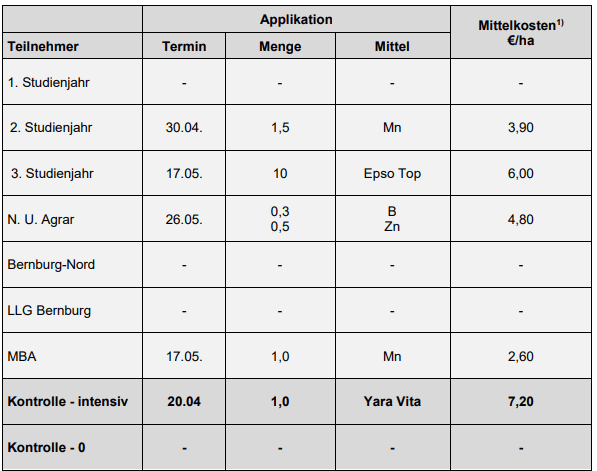 | Für die Erreichung von Höchsterträgen bei Winterweizen spielt die Mikronährstoffversorgung eine zunehmende Rolle. Für den Standort Bernburg besteht zusätzlich das Problem des hohen pH-Wertes, der zu Festlegungen der Mikronährstoffe im Boden führen kann. | |||
