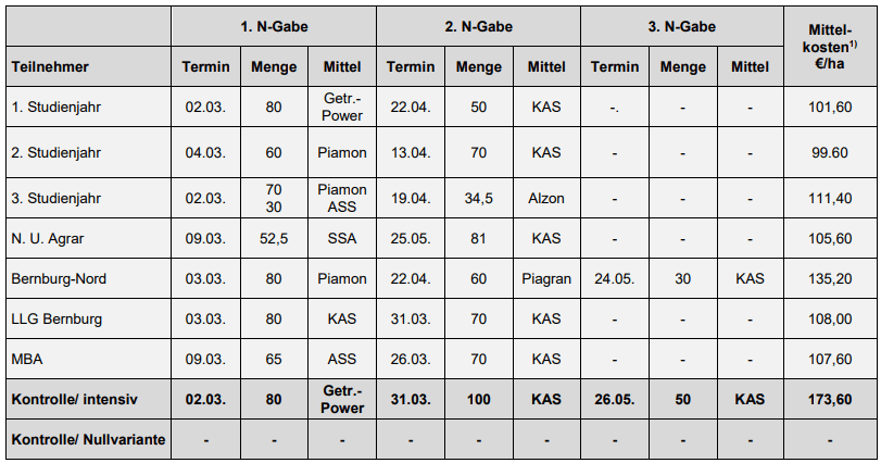 | Der N-Gehalt im oberen Bereich war relativ gering. Deshalb entschieden sich alle Teilnehmer für eine zeitige 1. N-Gabe, wobei 6 unterschiedliche Düngemittel zum Einsatz kamen. Da die Temperaturen in den nachfolgenden Wochen niedrig blieben, verzögerte sich auch die Wirkung der 1. N-Gabe. |