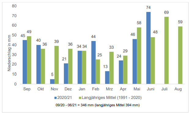 | Das Jahr 2021 war aus der Sicht der Witterung wie bereits beschrieben für das Wintergetreide günstig, so dass erstmals wieder das Ertragsniveau von 2015 erreicht werden konnte. Einschränkend muss erwähnt werden, dass die Niederschläge als Regenschauer örtlich sehr unterschiedlich ausfallen und zu deutlichen Ertragsunterschieden zwischen den Betrieben führen können. Die Qualitäten waren beim E-Weizen bis auf ein paar Probleme beim Rohproteingehalt sehr gut. Im Unterschied zur Wintergerste lagen auch die Werte zur Schüttdichte über dem geforderten Standard. | |||