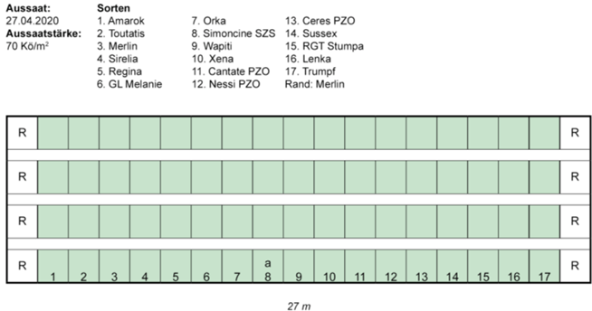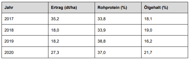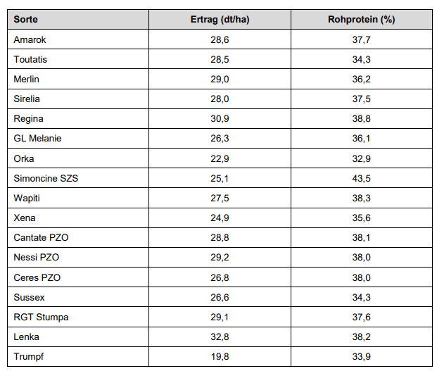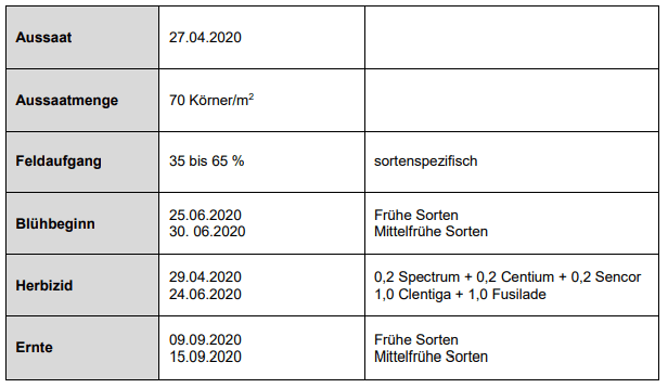 In Abstimmung mit der Landesanstalt für Landwirtschaft und Gartenbau Bernburg wurden als einer der drei Referenzstandorte für Lössböden die Landessortenversuche mit 17 Sorten durchgeführt. Wegen Gefahr von Fraßschäden durch Tauben wurden die Parzellen sofort nach der Aussaat abdedeckt und nach Aufnahme der Folien eingezäunt. Erst der Elektrozaun konnte Hasen von den Versuchsparzellen abhalten. Der Feldaufgang war auf Grund der Trockenheit im April (1 mm Niederschlag) schlecht. Aber auch die Sorten zeigten hier eine erhebliche Differenziertheit. Obwohl die Bestände im Juni einen sehr guten visuellen Eindruck machten, führte die Trockenheit in der Blühphase zur deutlichen Reduzierung der Ertragsanlagen.