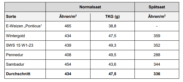 | Bestandesdichten und Tausendkorngewichte bei Winterdurum nach Sorten | |