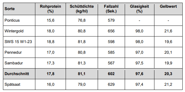 | Ausgewählte Qualitätsparameter bei Winterdurum 2019 nach Sorten | |