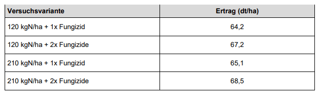 | Hinsichtlich der untersuchten Varianten waren bei dem niedrigen Ertragsniveau wie schon in den beiden Vorjahren die Unterschiede gering. Die N-Düngung hatte bei der Trockenheit kaum Auswirkungen, allein die zweite Fungizidapplikation brachte einen Mehrertrag. | |