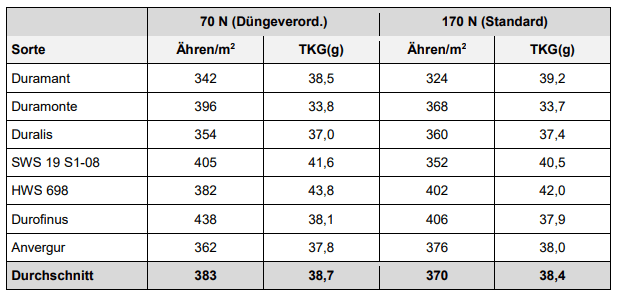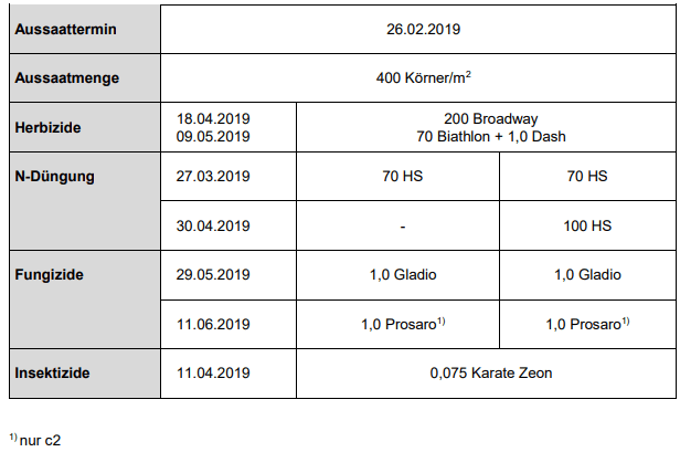 | Hinsichtlich der Bestandesführung waren 2019 die Einwirkungsmöglichkeiten gering. Wie aus der Tabelle hervorgeht, brachte eine höhere N-Düngung weder dichtere Bestände, noch ein höheres Tausendkorngewicht. Der trockene und sehr warme April verkürzte die Zeit für die Bestockung so dass insgesamt die Bestandesdichten gering ausfielen. Auch die Tausendkorngewichte lagen deutlich unter den Vorjahreswerten. | |