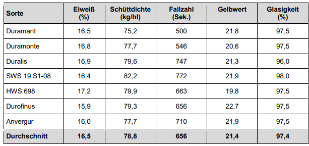 | Wie bereits im Vorjahr führte die extreme Trockenheit zu hohen Rohproteingehalten. Bei Fallzahlen und Glasigkeit wurden extrem hohe Werte erreicht. Unerwartet waren nach den Trockenperioden die guten Ergebnisse im Hektolitergewicht. | |