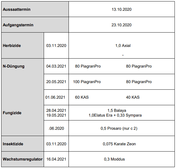 | Erträge bei Winterdurum 2021 nach Versuchsvarianten | |