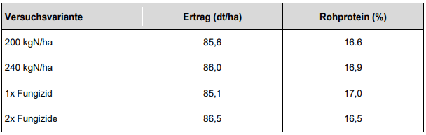 | Gegenüber der Erhöhung der N-Gabe zeigte die 2. Fungizidapplikation eine leichte Verbesserung im Ertrag, was aber auch gleich zur Senkung des Rohproteingehalts führte. | |