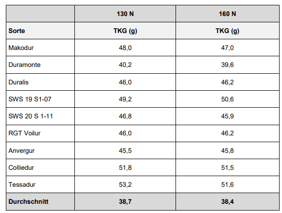 | Tausendkorngewichte bei Sommerdurum 2020 nach Sorten | |