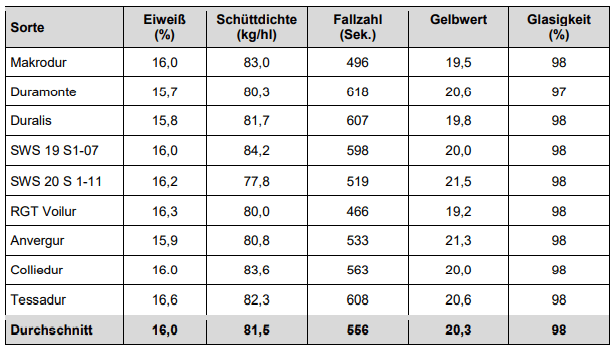| Ausgewählte Qualitätsparameter bei Sommerdurum 2020 nach Sorten | |