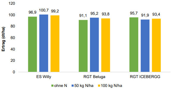 | Das Ertragsniveau war nach den vergangenen Magerjahren im Jahr 2021 sehr gut. Da bereits in den Vorjahren sichtbar wurde, dass hohe N-Gaben kaum zum Ertragszuwachs führen, wurde die Variante mit der höchsten N-Gabe auf 100 kg N/ha begrenzt. | |||