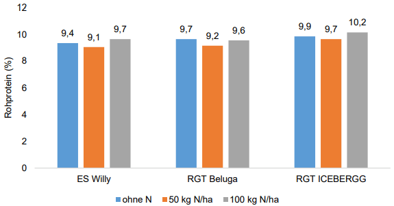 | Beim Rohproteingehalt zeigt sich eine gewisse Erhöhung mit zunehmender N-Düngung. Dies wirkt sich aber bei einer möglichen Vermarktung als Futtergetreide nicht auf den Preis aus. | |