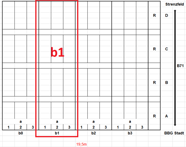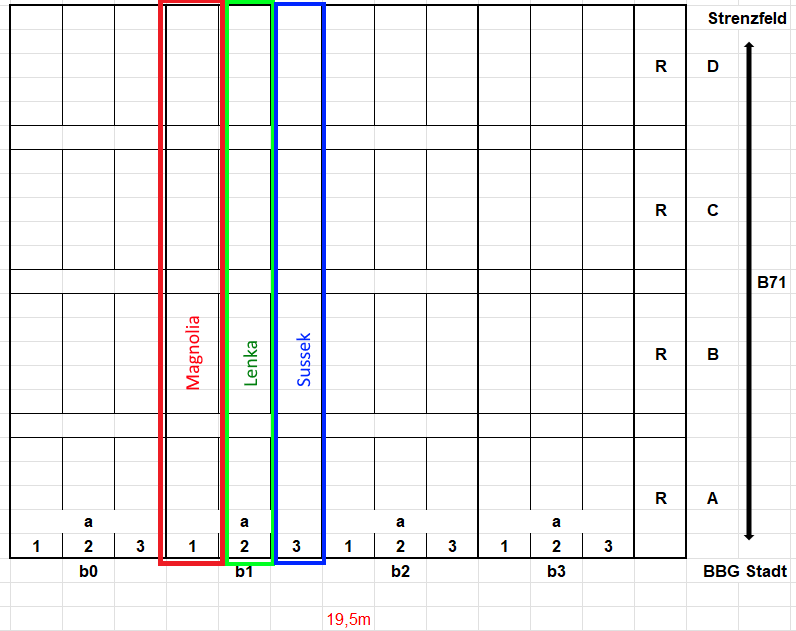 Der Abschnitt "b1" selbst in nochmals in a-Abschnitte eingeteilt. Wie auch die b-Abschnitte werden die a-Abschnitte jeweils 4-fach angelegt. Die a-Abschnitte im Beispiel zeigen dabei die verwendeten Sorten.
